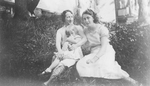 Description :ALICE ET CARMEN ASSISES DANS L'HERBE. THERESE EST SUR LES GENOUX DE SA MERE. PARTIE INFERIEURE D'UNE MAISON EN ARRIERE-PLAN.