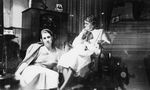 Description :CARMEN ASSISE SUR LE SOL A COTE DE GRATIA, ASSISE SUR UNE CHAISE. MEUBLE RADIO EN ARRIERE-PLAN. A DROITE, SUPERPOSITION A L'HORIZONTALE D'UNE PARTIE DE L'IMAGE. ON DISTINGUE UNE LAMPE, UNE HORLOGE, DES RIDEAUX ET UN CADRE PHOTO.