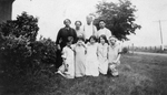 Description :PHOTO DE GROUPE A L'EXTERIEUR. DEVANT, LES 5 JEUNES FILLES SONT SUR LES GENOUX. ELLES SE TIENNENT PAR LES EPAULES. AURETTE LEMIRE (FILLE DE GRATIA GAGNE) EST LA QUATRIEME A PARTIR DE LA GAUCHE. ZELIE BILODEAU (MERE DE GRATIA) EST DEBOUT DERRIE...