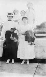 Description :DEUX DAMES DEVANT UN MURET. DERRIERE, TROIS FILLETTES DEBOUT SUR LE MURET. PORTRAIT DE GROUPE DE PIED EN CAP.