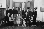 Description :PHOTO DE GROUPE PRISE DANS LE SALON DE LA RESIDENCE DU NOTAIRE ERNEST SYLVESTRE RUE BALL. 6.1 - DEVANT: MARCEL FORTIER, THERESE GOYETTE, RITA LEMIEUX. DANS UN FAUTEUIL, ERNEST SYLVESTRE, IDA GOYETTE. DERRIERE: GEORGES SYLVESTRE, ? BLAIS, TROIS...