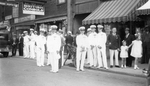 Description :DES MUSICIENS (SANS INSTRUMENT) EN HABIT DE PARADE DEVANT LA NATIONAL WALL PAPER CO RUE WELLINGTON NORD. PLUSIEURS PASSANTS. LE COMMERCE DONT L'AUVENT EST RELEVE EST LE SHERBROOKE NEWS STAND.