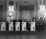 Description :10.1 - GUY BEGIN CHEF D'ORCHESTRE A DROITE. CINQ LUTRINS BLANCS AVEC DES PETITS DRAPEAUX DE L'U DE M. DOUZE MUSICIENS. SALLE AU DECOR OPULENT. 10.2 - ANGLE UN PEU DIFFERENT. GUY BEGIN DOS EN TRAIN DE DIRIGER LES MUSICIENS.