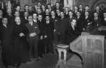 Description :PARMI LES MEMBRES DE LA CHORALE IL Y A, PREMIERE RANGEE: EUGENE TANGUAY (1ER), L'ABBE DOLOR BIRON (2EME), RENE JOUBERT (6EME), GEORGES SYLVESTRE (7EME), RAYMOND GAUVIN (8EME), LUCIEN GOYETTE (10EME), FRANCOIS LATULIPE (12EME) ET ? BISSON (13EM...
