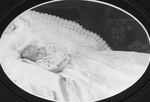 Description :LE BEBE MORT PORTE UNE PETITE ROBE BLANCHE ET EST COUCHE SUR UNE COUVERTURE BLANCHE.