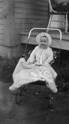 Description :UN BEBE DANS UNE POUSSETTE. CE DERNIER PORTE UN PYJAMA ET UN CHAPEAU BLANC. UNE COUVERTURE BLANCHE LE RECOUVRE. EN ARRIERE-PLAN, UNE CHAISE SUR LE PERRON D'UNE MAISON.