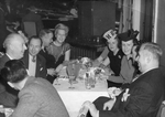 Description :AURETTE LEBLANC ET DES AMIS AUTOUR D'UNE TABLE. A GAUCHE, UN HOMME INCONNU, BRUCE WENDELL, DEUX HOMMES INCONNUS ET MIMI D'ESTEE. A DROITE, RAOUL LEBLANC, UN HOMME INCONNU, AURETTE LEBLANC ET DEUX FEMMES INCONNUES. A NOTER, AURETTE PORTE UN CHA...