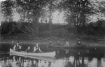 Description :JOSEPH-ALFRED LEBLANC ET J.L. MATHIEU ASSIS DANS UN CANOT RAMENT. UN GARCON ASSIS ENTRE LES DEUX HOMMES. PRES DE LA BERGE, QUATRE HOMMES PRENNENT PLACE DANS UNE CHALOUPE NOMMEE ALICE. DEUX HOMMES RAMENT. LA RIVIERE EST CALME. DE GRSO ARBRES EN...