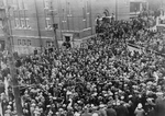 Description :1.1 : VUE A VOL D'OISEAU DE LA FOULE ASSEMBLEE SUR LA COTE KING. DE NOMBREUSES PERSONNES RASSEMBLEES LE LONG DE LA RUE ATTENDENT LE DEVOILEMENT DU MONUMENT. UNE JOURNEE GRISE. DES GENS SONT HABILLES EN MANTEAUX D'HIVER ET PORTENT DES CHAPEAUX....