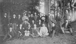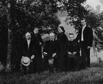 Description :GROUPE DE JEUNES HOMMES DANS LA NATURE. DES HOMMES POSENT DETENDUS. ALORS QUE CERTAINS SONT APPUYES SUR DES ARBRES, D'AUTRES SONT ASSIS PAR TERRE. LES HOMMES PORTENT UN COSTUME ET ONT DES DRAPEAUX OU DES CANNES DANS LEURS MAINS. M. LEBLANC, AS...