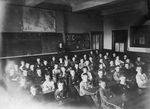 Description :LA CLASSE D'ECOLIERS AVEC LEUR PROFESSEUR. ON APERCOIT, UN TABLEAU NOIR, UNE CARTE GEOGRAPHIQUE ET 49 ELEVES PLACES DEUX PAR DEUX EN QUATRE RANGEES, ASSIS A LEUR BANC. DE GAUCHE A DROITE EN PARTANT DU FOND DE LA CLASSE ET PAR RANGEE DE DEUX: B...