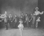 Description :DES ENFANTS ET LEUR CHOREGRAPHE DEGUISES PERSONNAGES, EN MOUVEMENT. QUATRE ENFANTS DANSENT A L'ARRIERE ET CINQ AUTRES SE TIENNENT LES MAINS DEVANT EUX. LE DIXIEME ENFANT EST ACCROUPI DEVANT LES AUTRES. LEUR CHOREGRAPHE EST A DROITE D'EUX. ISEU...
