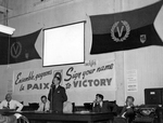 Description :VUE DU PETIT THEATRE. AU PREMIER PLAN, TABLES DERRIERE LESQUELLES APPARAISSENT LES RESPONSABLES DE LA NEUVIEME CAMPAGNE DE SOUSCRIPTION. DE GAUCHE A DROITE: CHARLES STEELE, TED HARPERT ET DEBOUT DERRIERE LE MICROPHONE, W.H. GRIFFITH, H. SOPER ...