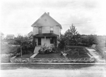 Description :VUE D'UNE MAISON DE 2 ETAGES ET DEMI EN BOIS. A L'AVANT, UN ESCALIER ET UN PERRON. AUTOUR DE LA MAISON, DES ARBRES ET UN BOSQUET D'HYDRANGEES. EN AVANT-PLAN, LA RUE LONDON ET DES ENFANTS ASSIS SUR LA PELOUSE. EN ARRIERE-PLAN, D'AUTRES MAISONS ...
