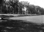 Description :AU PREMIER PLAN, LE CHAMP-DE-MARS AVEC AUTOUR DES BANCS ET DES ARBRES. EN ARRIERE-PLAN, LE BOULEVARD QUEEN NORD SUR LEQUEL ON APERCOIT DIVERSES MAISONS COSSUES.