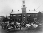 Description :VUE SUR LA CASERNE DE POMPIER (STATION 1) CONSTRUITE EN 1877. AU PREMIER PLAN, ON VOIT DES POMPIERS AVEC LEURS EQUIPEMENTS, CHARETTES ET CHEVAUX. SUR LA GAUCHE, LE CLOCHER DE L'EGLISE ST-ANDREW. A DROITE, UNE PARTIE DU SEMINAIRE ST-CHARLES.