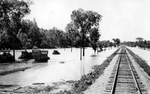 Description :VUE DU DEBORDEMENT DE LA RIVIERE LE LONG DE LA VOIE FERREE DU CANADIEN NATIONAL, VERS LENNOXVILLE.