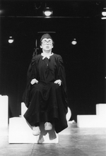 Description :19.1 - GROS PLAN SUR UN NOUVEAU PROFESSEUR (ISABELLE HODGSON). CE DERNIER PORTE UNE TOGE, UNE TOQUE ET DES LUNETTES. 19.2 ET 19.3 - L'AGENT DE SECURITE (ISABELLE HODGSON) POINTE SA MATRAQUE VERS UN CADEAU QU'UN PROFESSEUR (JACQUES JALBERT) VIE...