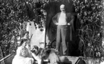 Description :TROIS MEMBRES D'UNE FAMILLE NON IDENTIFIEE REUNIS DEVANT LA MAISON FAMILIALE. AVEC EUX UN CHIEN COLLEY.