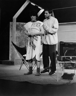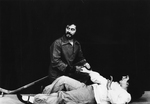 Description :25.1 - LES COMEDIENS POSENT DEVANT LES DECORS. DE GAUCHE A DROITE, ISABELLE HODGSON, JACQUES ROUTHIER ET DENIS MICHAUD. EN ARRIERE-PLAN, UN SOLDAT EST DESSINE. A DROITE, UN PARAVENT SUR LEQUEL ON PEUT LIRE LE NOM DE LA PIECE. 25.2 - LES TROIS ...