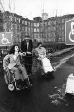 Description :13.1 - HELENE BLAIS, JACQUES JALBERT ET JEAN LESSARD DEVANT L'HOPITAL D'YOUVILLE. HELENE BLAIS ET JEAN LESSARD SONT ASSIS DANS DES CHAISES ROULANTES TANDIS QUE JACQUES JALBERT EST DEBOUT ENTRE LES DEUX. A GAUCHE ET A DROITE, UN PANNEAU POUR HA...