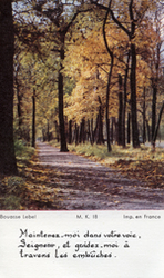 Description :DANS UNE FORET EN AUTOMNE, UN SENTIER BORDE D'ARBRES A FEUILLES JAUNES. AU VERSO, INSCRIPTION: "BERNARD LACROIX DE LA CONGREGATION DE SAINTE-CROIX, PRETRE LE 23 DECEMBRE 1961".