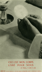 Description :SUR UNE NAPPE, LE PIED D'UN CALICE DEVANT DEUX MAINS TENANT UNE GROSSE HOSTIE SUR LAQUELLE IL Y A UNE CROIX. AU VERSO, L'INSCRIPTIONS: "GILLES LABELLE DE LA CONGREGATION DE SAINTE-CROIX, PRETRE, LE 23 DECEMBRE 1961.