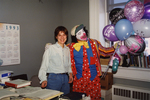 Description :UN CLOWN DANS UN COSTUME ROUGE OFFRE A FRANCE LEFEBVRE UN GROS BOUQUET DE BALLONS.