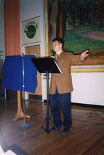 Description :AU CENTRE, GUTH DESPREZ RACONTANT DES HISTOIRES SUR LES CANADIENS EN EUROPE LORS DE LA PREMIERE GUERRE MONDIALE. A SA DROITE, UN MICRO.