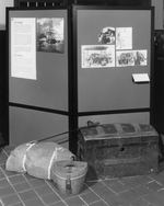 Description :DEUX PANNEAUX D'EXPOSITION SUR LESQUELS DES PHOTOS ET DES TEXTES SONT AFFICHES. DEVANT CES PANNEAUX, SE TROUVENT UN COFFRE DE VOYAGE, UN PAQUET EN JUTE ET UNE ANCIENNE VALISE A CHAPEAU.