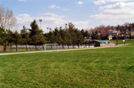 Description :VUE A PARTIR DE LA RUE MALOUIN. A L'AVANT-PLAN, LE TERRAIN DE SOCCER. PAVILLON DES SALLES DE DESHABILLAGE POUR LA PISCINE.