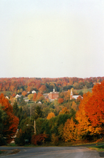 Description :SUR UNE ROUTE QUI PASSE DANS FRELIGHSBURG, ON VOIT UNE PARTIE DU VILLAGE ENTOURE D'ARBRES FEUILLUS AUX COULEURS D'AUTOMNE.