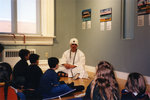 Description :8.1 - PHOTO PRISE A LA SALLE DE L'AMERICAN-BILTRITE LE 9 JANVIER 1999, PENDANT L'EXPOSITION "LEGENDES DE L'AMERIQUE FRANCAISE". ASSIS PAR TERRE DEVANT UN GROUPE D'ENFANTS, LOUIS LAVOIE, DEGUISE EN ROI MAGE PRESENTE UNE ANIMATION POUR L'EPIPHAN...
