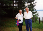 Description :SUR LE BORD DU LAC MEMPHREMAGOG. A GAUCHE, GILLES DALLAIRE, JOURNALISTE ET A DROITE, JACQUES BOISVERT PRESIDENT DE LA SOCIETE D'HISTOIRE DU LAC MEMPHREMAGOG.
