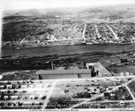 Description :4.1 - VUE DE LA FACADE DE LA COMPAGNIE. A L'AVANT, QUARTIER RESIDENTIEL CREE PAR LA SHERBROOKE HOUSING ET COMPRENANT DES MAISONS DE 2 OU 4 LOGEMENTS. A L'ARRIERE DE L'USINE, VOIES FERREES DU CANADIEN PACIFIQUE. SUR LA RIVE NORD DU LAC DES NATI...