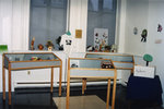 Description :VUE D'ENSEMBLE DE LA BOUTIQUE. A GAUCHE, 2 PRESENTOIRS SUR PATTES CONTENANT DES LIVRES. AU CENTRE, UNE PETITE TABLE CARREE COUVERTE D'UNE NAPPE NOIRE. A DROITE, UNE ETAGERE BLANCHE AVEC DEUX PORTES VITREES CONTENANT DES LIVRES ET DES OBJETS. A...