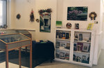 Description :15.1 - COIN BOUTIQUE AVEC TROIS PRESENTOIRS SUR PATTES, AVEC VITRE SUR LE DESSUS, CONTENANT DES LIVRES ET DES OBJETS. SUR LE BORD DES FENETRES ET AU MUR, SONT INSTALLEES DES PIECES D'ARTISANAT A VENDRE. A DROITE, UNE PETITE TABLE CARREE COUVER...