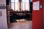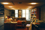 Description :VUE DE LA SALLE DES CHERCHEURS DE LA S.H.S. A GAUCHE, MARC GENEST EST DERRIERE UN BUREAU DE TRAVAIL ET ANDRE TESSIER EST ASSIS DERRIERE LA GRANDE TABLE DE TRAVAIL. DERRIERE EUX, LE KARDEX DES FICHES D'INDEXATION DES JOURNAUX. A DROITE, LE RAYO...
