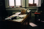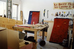 Description :19.1 - VUE DE LA SALLE MULTIFONCTIONNELLE AU REZ-DE-CHAUSSEE DE LA S.H.S. ON VOIT UNE TABLE DE MENUISERIE, DES PANNEAUX. SUR LE MUR DU FOND, UNE ENSEIGNE SUR LAQUELLE ON PEUT LIRE "LA SOCIETE D'HISTOIRE DES CANTONS DE L'EST, FONDEE LE 2 MARS 1...