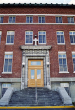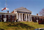 Description :FACADE DU MANEGE MILITAIRE "THE SHERBROOKE HUSSARS". BATIMENT DE 2 ETAGES EN BRIQUES ORANGEES. AU CENTRE, UNE FACADE RAPPELANT UN TEMPLE GREC PAR SES SIX COLONNES DORIQUES BLANCHES. A GAUCHE, LA DRAPEAU DU CANADA EN BERNE POUR LA MORT DE QUATR...