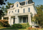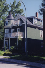 Description :MAISON D'INFLUENCE QUEEN ANN, 3 ETAGES EN PLANCHES DE BOIS A CLIN, PEINTES EN VERT. GALERIES ET CADRES DE FENETRES PEINTS EN BLANC. TOURELLE A GAUCHE DU BATIMENT.