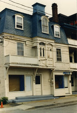Description :FACADE DE LA MAISON SITUEE AU 12-20 WINDSOR EN PLANCHES A CLIN PEINTES EN BLANC. LE TOIT A LA MANSART EN BARDEAUX D'ASPHALTE PEINTS EN BLEU. INFLUENCE SECOND EMPIRE. UN PETIT COMMERCE PORTE L'ECRITEAU ARTE 16.