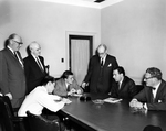 Description :VUE DE LA SALLE DU CONSEIL D'ADMINISTRATION (BOARD ROOM) DE LA RAND. DE GAUCHE A DROITE: INCONNU; T. HARBERT, GERANT DU TRAVAIL DE LA MANUFACTURE; PUIS, ASSIS, DEUX JOURNALISTES NON-IDENTIFIES; H.R. BYRD, GERANT DU DEPARTEMENT D'EXPORTATION DE...