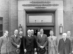 Description :DIGNITAIRES PRENANT LA POSE DEVANT L'ENTREE DE L'EDIFICE NUMERO UN DE LA RAND. DE GAUCHE A DROITE: C.-W. DUNN, PRESIDENT DU CLUB LIONS ; LE CONSEILLER GUY BRYANT, MAIRE SUPPLEANT; GEORGE DICK, ASSISTANT-TECHNICIEN DU GERANT DES TRAVAUX; M. S.-...