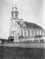 Description :VUE EXTERIEURE DE L'EGLISE. L'EGLISE A DES FENETRES A L'ITALIENNE, UNE PARTIE EN SAILLIE A L'AVANT, UN CLOCHER PRINCIPAL ET DEUX CLOCHERS LATERAUX PLUS PETITS.