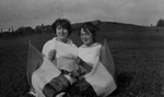 Description :1.1 ET 1.2 - DEUX FILLES ASSISES SUR LE GAZON PORTENT DES VETEMENTS BLANCS. EN ARRIERE-PLAN IL Y A DES MAISONS. LES PHOTOGRAPHIES ONT ETE PRISES DE DIFFERENTS POINTS DE VUE. LA FILLE A GAUCHE EST LA MEME DANS LES DEUX PHOTOGRAPHIES. LA FILLE A...