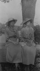 Description :DEUX FEMMES SONT ASSISES SUR UNE GROSSE PIECE DE BOIS. ELLES SONT HABILLEES AVEC DES VETEMENTS LEGEREMENTS SIMILAIRES, UN CHAPEAU ET DES GANTS BLANCS. LES DEUX ONT LA MEME POSITION. LA FEMME A DROITE NE PORTE PLUS SES GANTS CAR ELLE A UN PORTE...