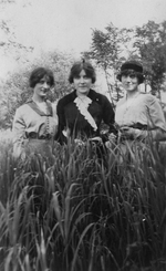 Description :TROIS FEMMES ENTRE DES PLANTES. LA VEGETATION CACHE LA MOITIE DES CORPS. LES TROIS REGARDENT L'APPAREIL PHOTOGRAPHIQUE ET EN ARRIERE IL Y A DES ARBRES.