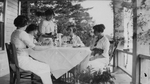 Description :VUE PARTIELLE D'UNE GALERIE OU SONT ASSISES AUTOUR D'UNE TABLE QUATRE FEMMES PRENANT LE DINER. UNE AUTRE FEMME EST DEBOUT ET PRESENTE UNE ASSIETTE AUX AUTRES. UNE DEMOISELLE LEBEL EST PRESENTE.
