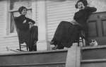 Description :DEUX FEMMES SONT ASSISES SUR DES CHAISES SUR LA GALERIE D'UNE MAISON. LES DEUX SONT HABILLEES EN NOIR DE FACON SIMILAIRE. ON PEUT VOIR LEURS CHAUSSURES, UN CHAT A DROITE ET LA GALERIE, UNE FENETRE ET UNE PORTE PARTIELLEMENT. LA PHOTO A ETE PRI...